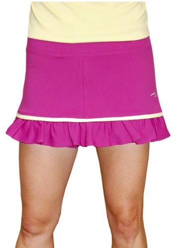 Cute Ruffled Tennis / Fitness Skorts by Impact Fitness. The Tournament Skirt features a flat, non-constricting waistband and Ruffled Edge Detail on the Skirt. It is fitted though the hips/rear and is aprox 12.5" Long. Full built in shorts underneath the skirt with chafe-free seams. This unique style will set you apart at any race, match, or workout! Sizing: XS = 0, S = 2/4, M = 6/8, L = 10. Made in the USA
