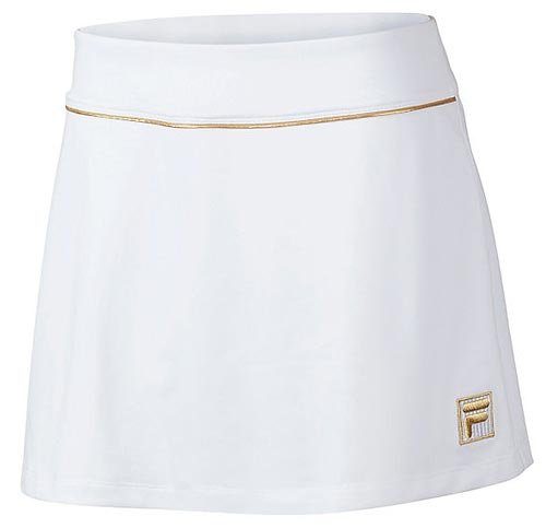 Worn by WTA Pro Kim Clijsters, the Fila Women's Wimbledon Tennis Skort features a sleek A-line silhouette with stretch metallic gold binding. Moisture wicking fabric with built-in UV protection keeps you cool, dry, and protected while you play. Skort includes built-in shorts for coverage.